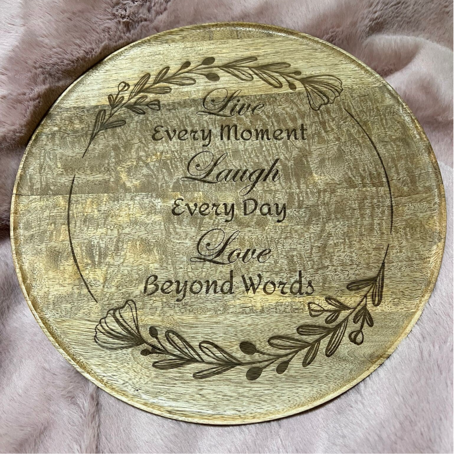 Dit is een houten serveerbord met de tekst 'Live every moment, laugh every day and love beyond words'.